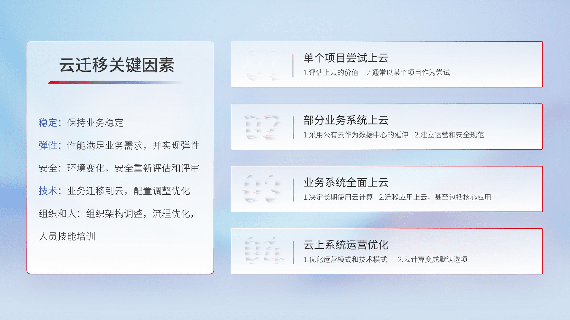 结合实际业务,,,从规划设计、、云平台选型、、、云原生改造、、、数据迁移、、集成交付,,,,迁移全过程为客户识别最佳上云路径,,做好风险识别管理,,设计网络架构、、身份权限、、、、安全审计合规、、、操作审计、、日志审计、、、监控告警策略、、、多站点容灾设计等,,对云上基础设施进行整体规划,,提升IT治理水平,,,以满足弹性、、、高可用、、、、高性能的需求。。