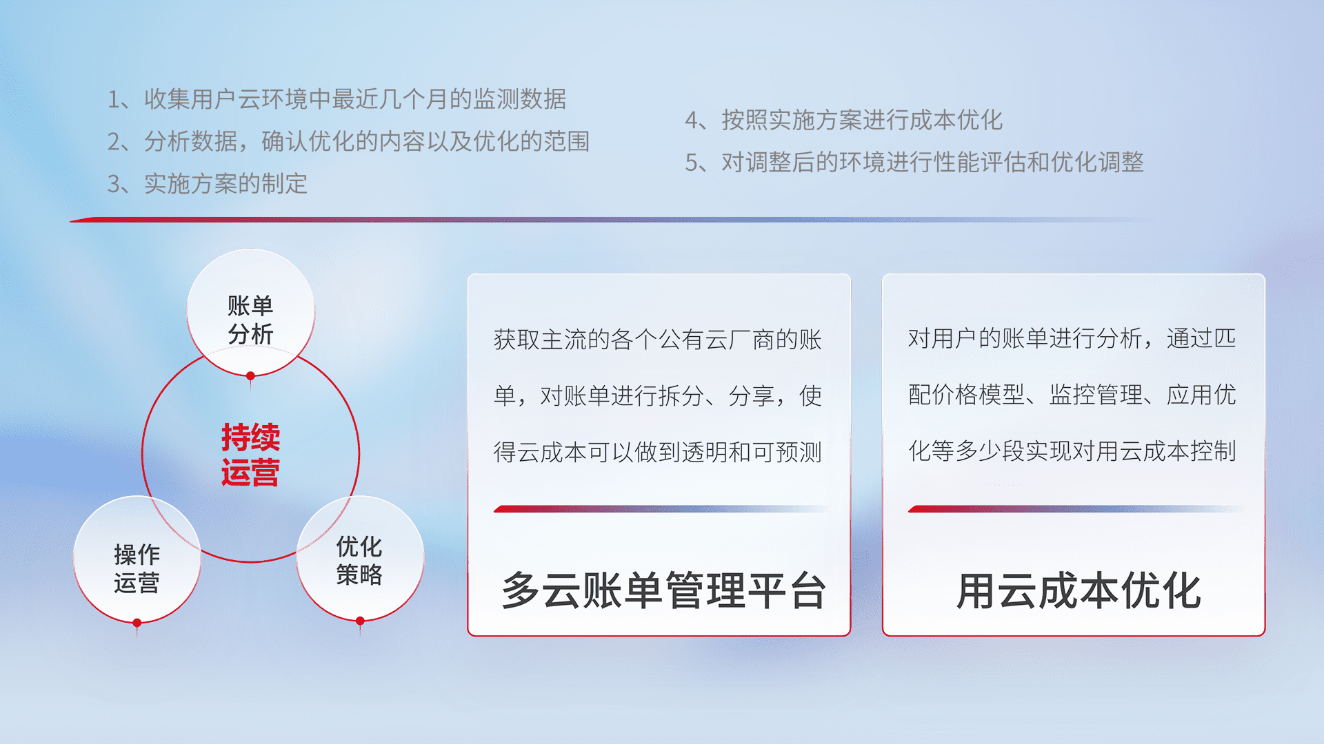 通过多云纳管,,,,以统一的资源数据模型把客户的云资源进行抽象和封装,,进而实现对多云资源的统一操作,,保障云资源管理的可靠性、、稳定性与可用性。。。。量身定制化运维内容,,配置、、开发运维、、、补丁管理、、、备份、、、监控、、、认证和访问管理、、、审计和日常巡检等,,,保障在用云过程中的可靠度,,,稳定度以及高可用率。。。。